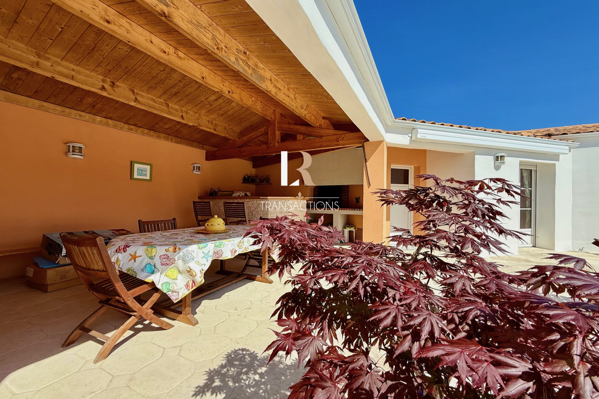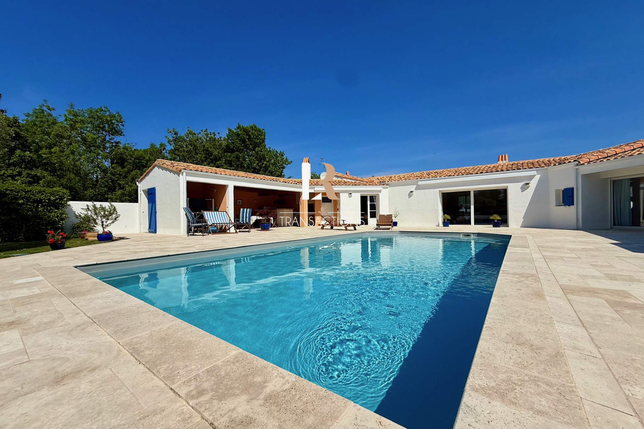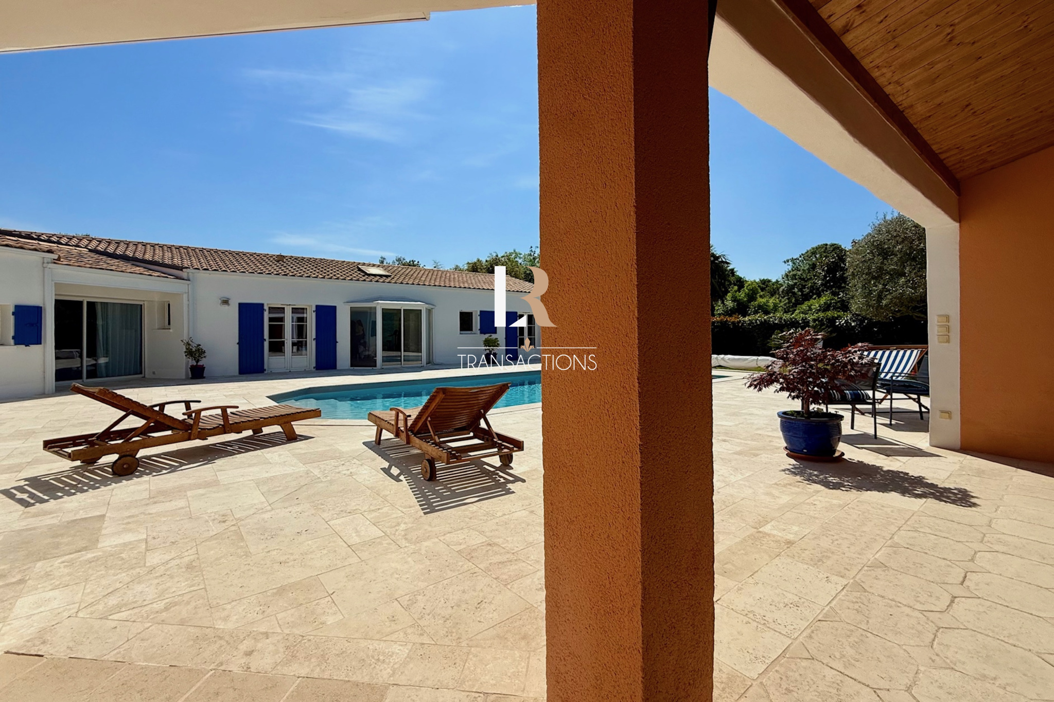 LR Transactions vous propose : Sur la commune de Lagord, à 15min en vélo de l'hypermarché centre rochelais, dans une impasse, spacieuse maison de plain pied de 2002 sur une belle parcelle arborée sans vis-à-visa Un portail automatique s'ouvre sur un bel espace de stationnement et donne accès à un grand garage et son atelier. L'entrée centrale offre une jolie perspective sur l'espace extérieur. Sur votre droite, vous découvrirez une belle pièce de vie traversante avec cheminée s'ouvrant par des baies à galandage sur la terrasse en pierre et sa piscine chauffée. Dans sa continuité une grande cuisine et son arrière cuisine feront le bonheur des amateurs de bons plats. Cette dernière donne accès, à une vraie cave, au garage. Sur la gauche de l'entrée, vous y trouverez un bureau, un petit salon (les deux pouvant devenir des chambres supplémentaires si besoin). Trois chambres dont une spacieuse suite parentale avec dressing et salle de bain donne accès à un premier espace bien-être avec jacuzzi. La seconde possède un petit salon et une salle d'eau privative, et bénéficie d'une entrée indépendante parfaite pour vos invités. La troisième avec placard est attenante à une salle d'eau indépendante. Trois wc indépendants sont repartis intelligemment dans cette spacieuse maison. Pour un maximum de bien-etre un hammam complète l'espace intérieur. À l'extérieur, une grande cuisine d'été entièrement ouvertes sur la terrasse et offre une vue sur le fond de jardin arboré. La maison est non mitoyenne, le jardin verdoyant parfaitement entretenu entoure cette maison à l'état irréprochable et la construction est de très bonne manufacture. Seul un petit coup de remise au goût du jour côté décoration est à prévoir, l'agencement est fluide et fonctionnel;