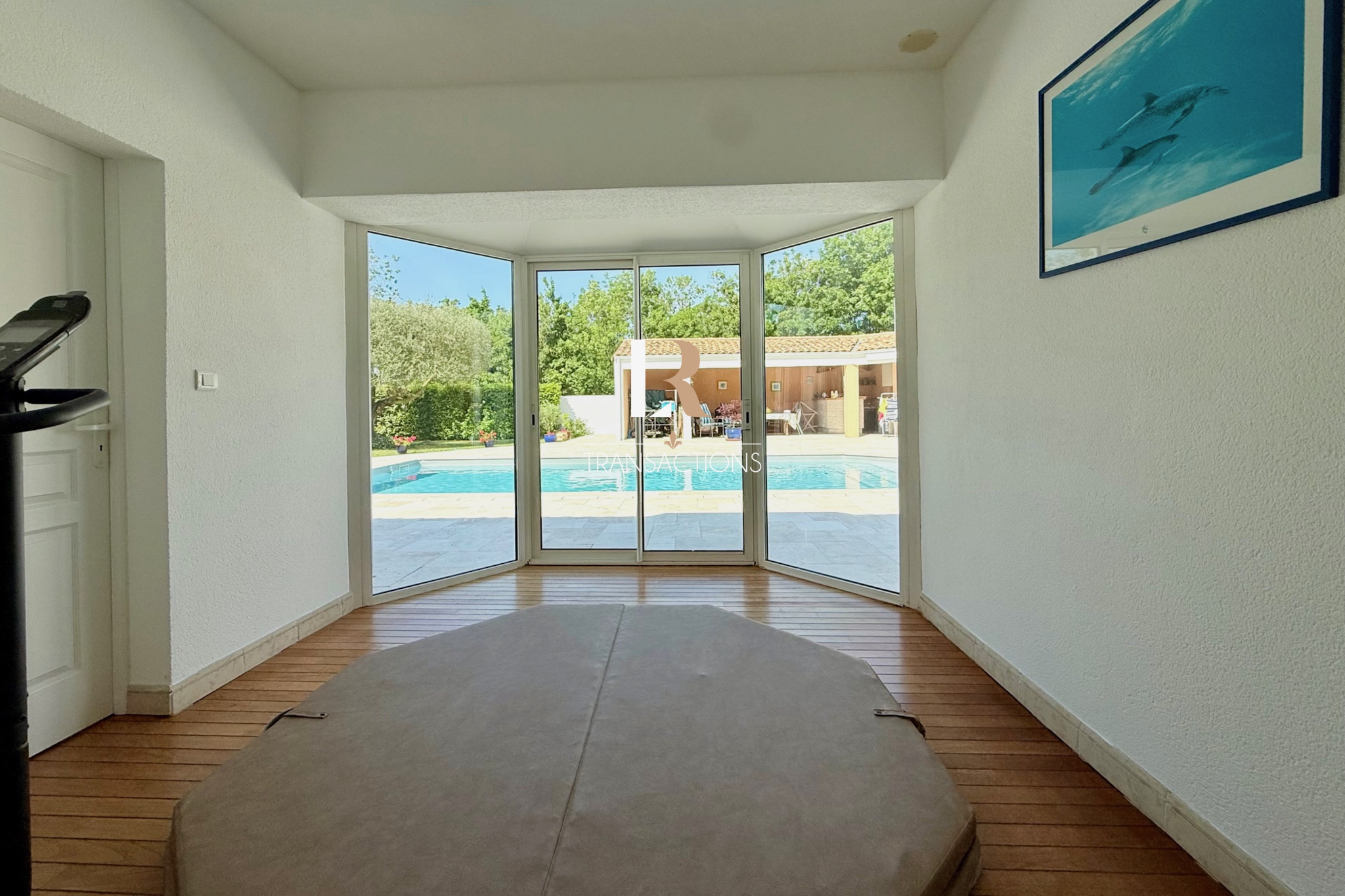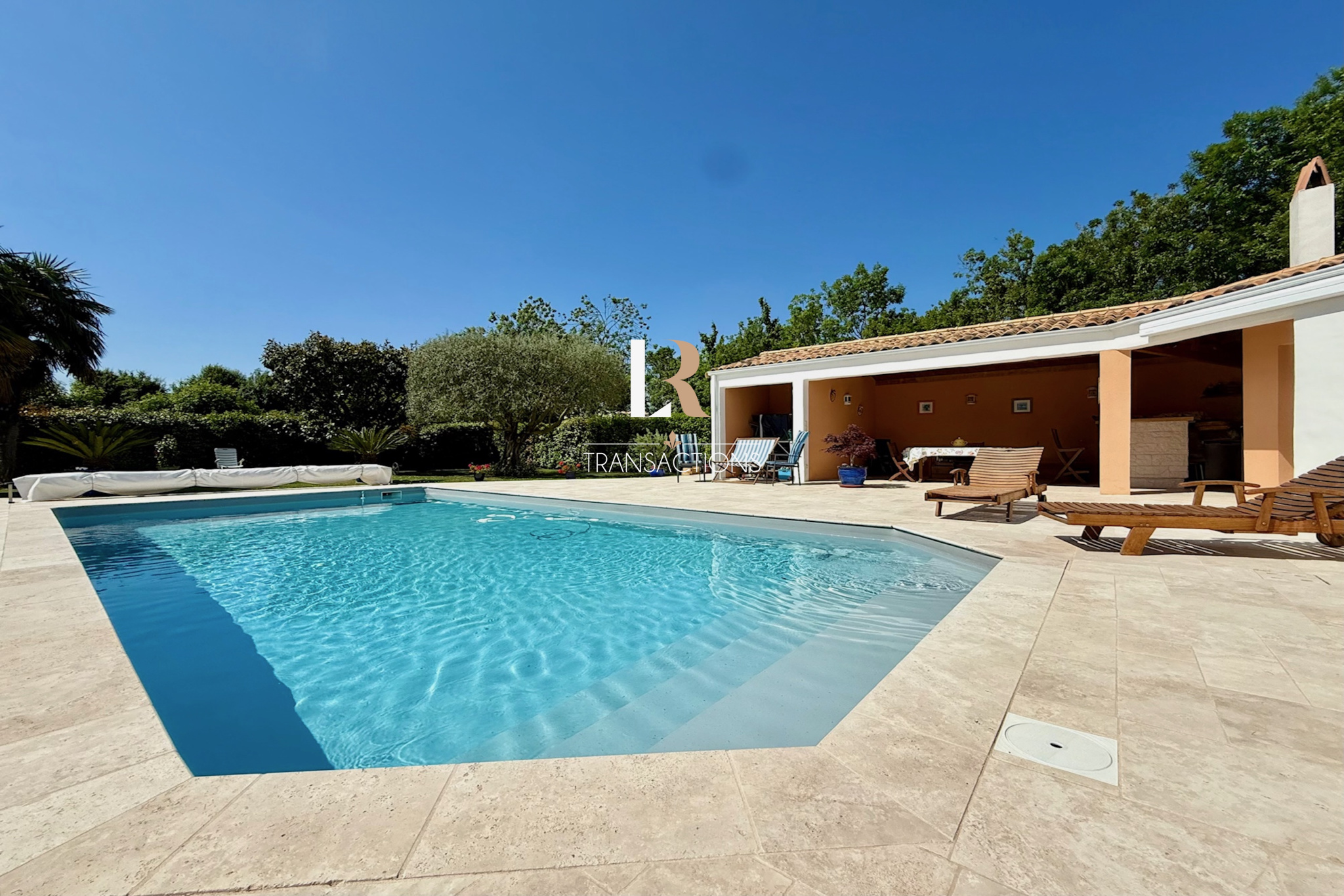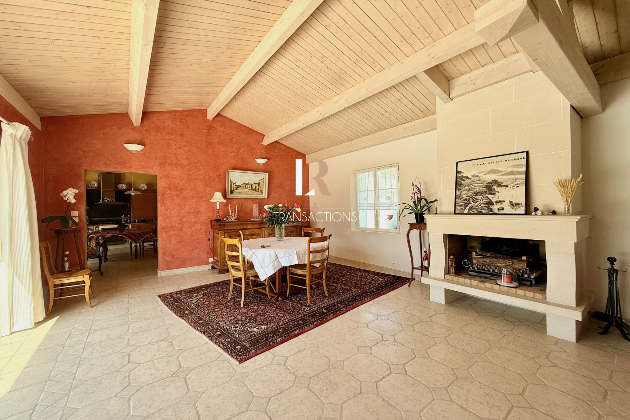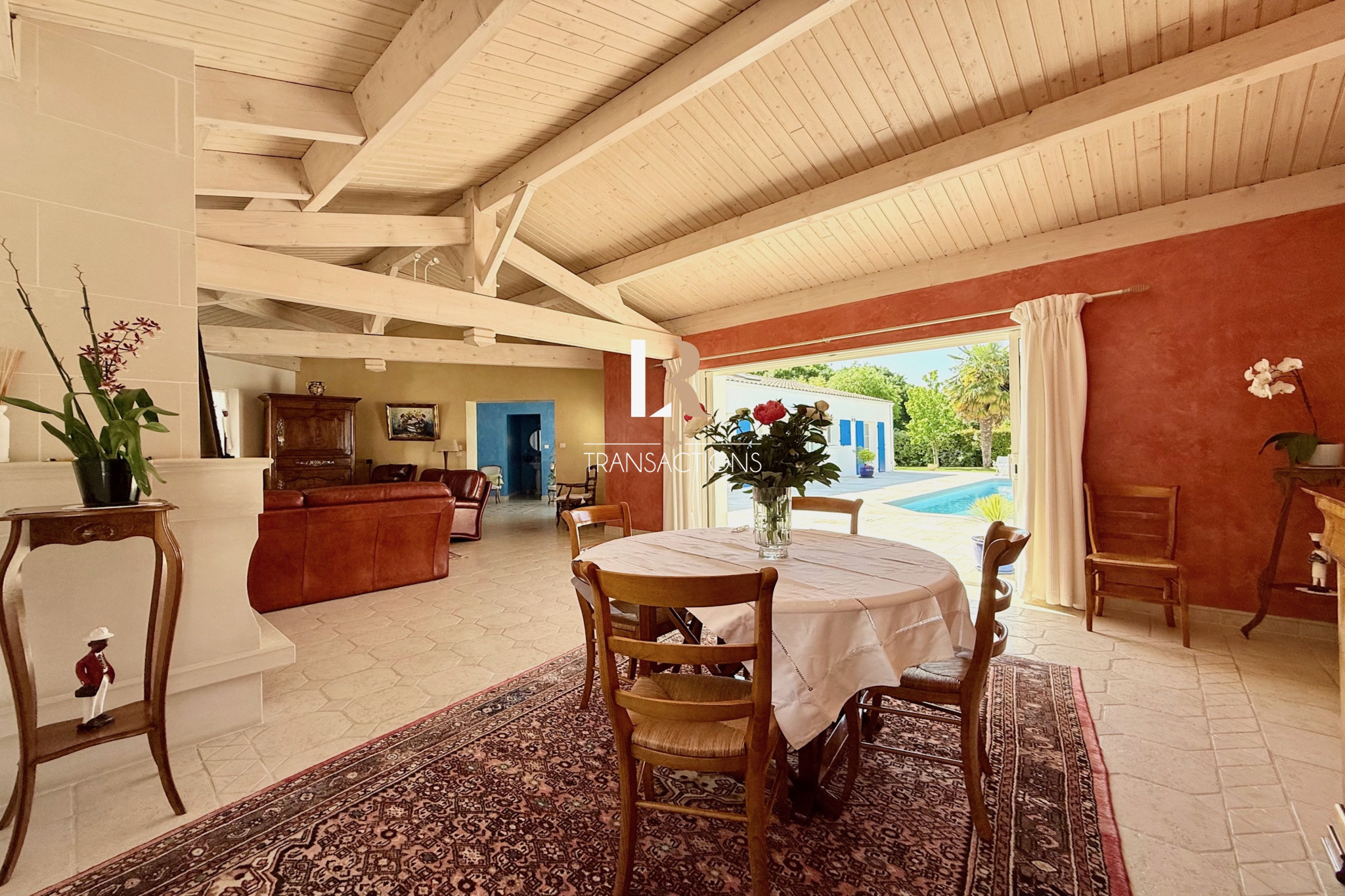 LR Transactions vous propose : Sur la commune de Lagord, à 15min en vélo de l'hypermarché centre rochelais, dans une impasse, spacieuse maison de plain pied de 2002 sur une belle parcelle arborée sans vis-à-visa Un portail automatique s'ouvre sur un bel espace de stationnement et donne accès à un grand garage et son atelier. L'entrée centrale offre une jolie perspective sur l'espace extérieur. Sur votre droite, vous découvrirez une belle pièce de vie traversante avec cheminée s'ouvrant par des baies à galandage sur la terrasse en pierre et sa piscine chauffée. Dans sa continuité une grande cuisine et son arrière cuisine feront le bonheur des amateurs de bons plats. Cette dernière donne accès, à une vraie cave, au garage. Sur la gauche de l'entrée, vous y trouverez un bureau, un petit salon (les deux pouvant devenir des chambres supplémentaires si besoin). Trois chambres dont une spacieuse suite parentale avec dressing et salle de bain donne accès à un premier espace bien-être avec jacuzzi. La seconde possède un petit salon et une salle d'eau privative, et bénéficie d'une entrée indépendante parfaite pour vos invités. La troisième avec placard est attenante à une salle d'eau indépendante. Trois wc indépendants sont repartis intelligemment dans cette spacieuse maison. Pour un maximum de bien-etre un hammam complète l'espace intérieur. À l'extérieur, une grande cuisine d'été entièrement ouvertes sur la terrasse et offre une vue sur le fond de jardin arboré. La maison est non mitoyenne, le jardin verdoyant parfaitement entretenu entoure cette maison à l'état irréprochable et la construction est de très bonne manufacture. Seul un petit coup de remise au goût du jour côté décoration est à prévoir, l'agencement est fluide et fonctionnel;