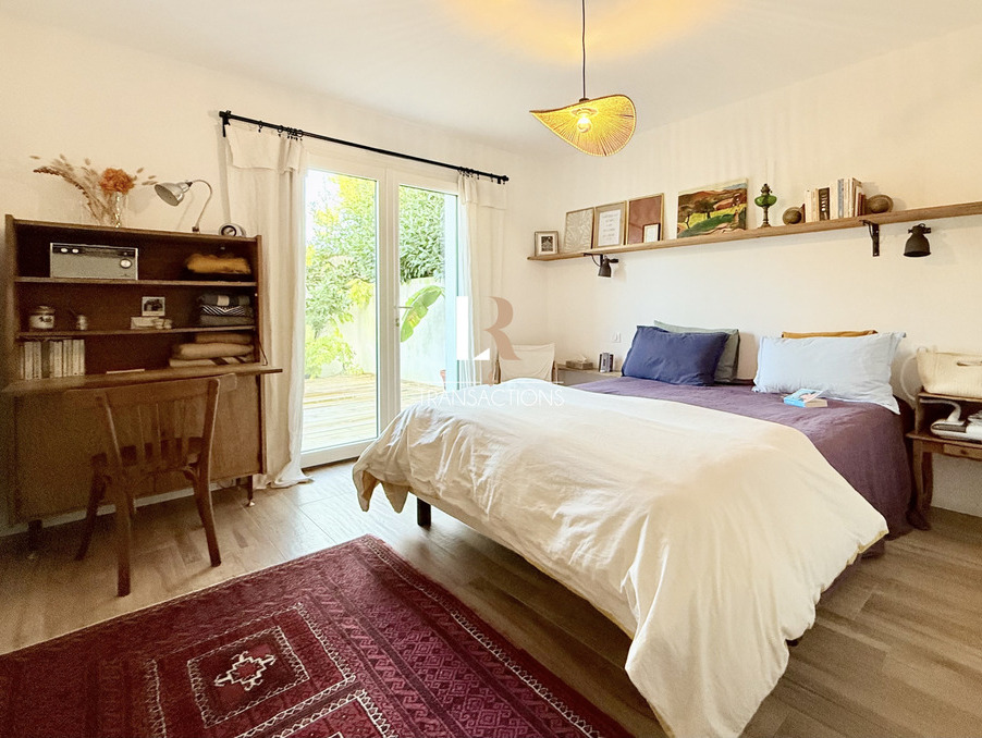 Dans le triangle d'or du quartier de la genette, entre le bord de mer, les commerces et le centre-ville. Jolie maison de plain-pied construite en 2019 aux normes RT2012 - DPE A (très faible consomation), avec quadruple garage et appartement T3. La maison principale entièrement de plain-pied, offre une spacieuse pièce de vie de plus de 60m2 extrèmement lumineuse, et chaleureuse grâce à son plafond rampant et ses poutres apparentes. Cette dernière s'ouvre par une grande baie vitrée sur le jardin plein Sud, et un premier patio exposé Ouest. L'espace nuit se compose de trois chambres, dont une chambre parentale avec salle d'eau et wc privatif. Toutes les chambres profitent d'un accès aux différents extérieurs. Un bureau ou chambre d'appoint (8,20m2), une salle d'eau indépendante avec wc, un cellier et un wc avec lave-main complètent cette maison de plain-pied. La maison profite d'un dispositif de chauffage innovant, appélé Plafino, pompe à chaleur et géothermie permettent de diffuser une chaleur douce par le plafond, et est aussi réversible pour y apporter de la fraicheur l'été.