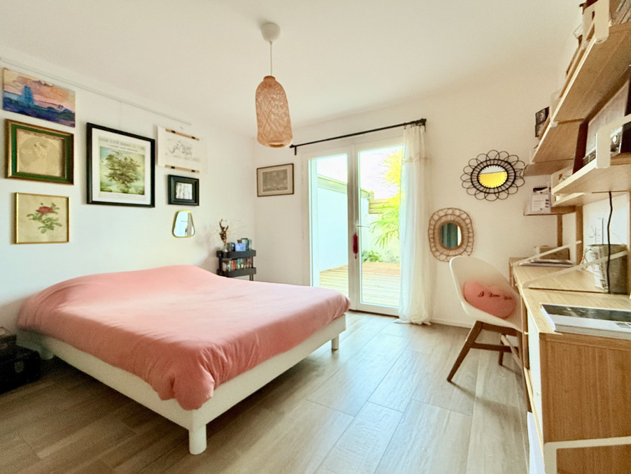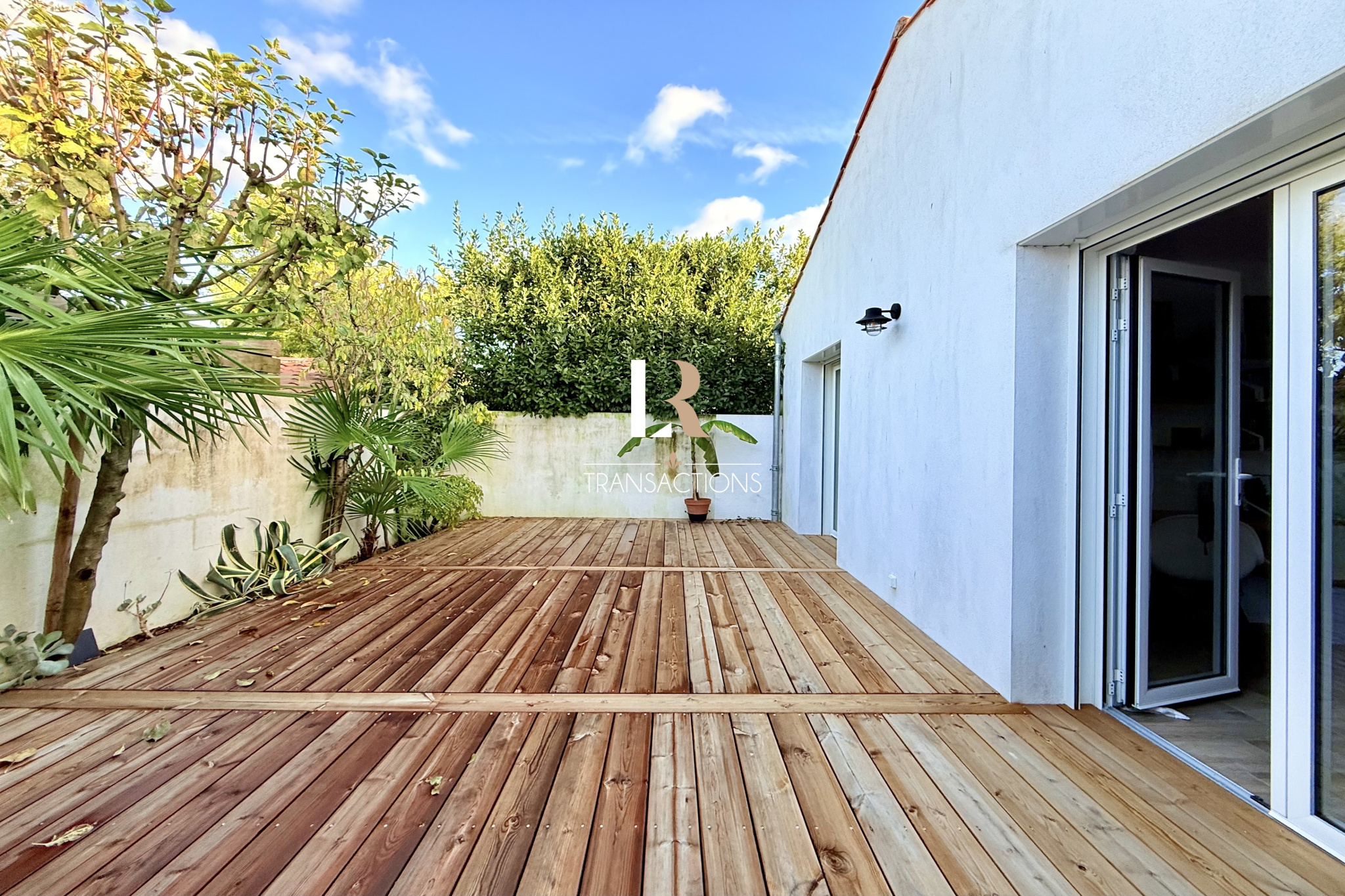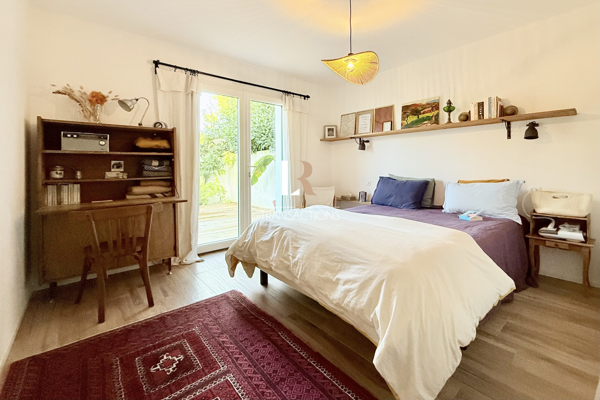 Dans le triangle d'or du quartier de la genette, entre le bord de mer, les commerces et le centre-ville. Jolie maison de plain-pied construite en 2019 aux normes RT2012 - DPE A (très faible consomation), avec quadruple garage et appartement T3. Les propriétaires ont décidé de faire appel à un architecte pour valoriser, optimiser la maison et ses constructions annexes par des choix structurels et techniques sérieux afin d'avoir des bases neuves et bien réalisées, et surtout un vrai confort au quotidien grâce au système de chauffage choisi. La maison principale entièrement de plain-pied, offre une spacieuse pièce de vie de plus de 60m2 extrèmement lumineuse, et chaleureuse grâce à son plafond rampant et ses poutres apparentes. Cette dernière s'ouvre par une grande baie vitrée sur le jardin plein Sud, et un premier patio exposé Ouest. L'espace nuit se compose de trois chambres, dont une chambre parentale avec salle d'eau et wc privatif. Toutes les chambres profitent d'un accès aux différents extérieurs. Un bureau ou chambre d'appoint (8,20m2), une salle d'eau indépendante avec wc, un cellier et un wc avec lave-main complètent cette maison de plain-pied. La maison profite d'un dispositif de chauffage innovant, appélé Plafino, pompe à chaleur et géothermie permettent de diffuser une chaleur douce par le plafond, et est aussi réversible pour y apporter de la fraicheur l'été.