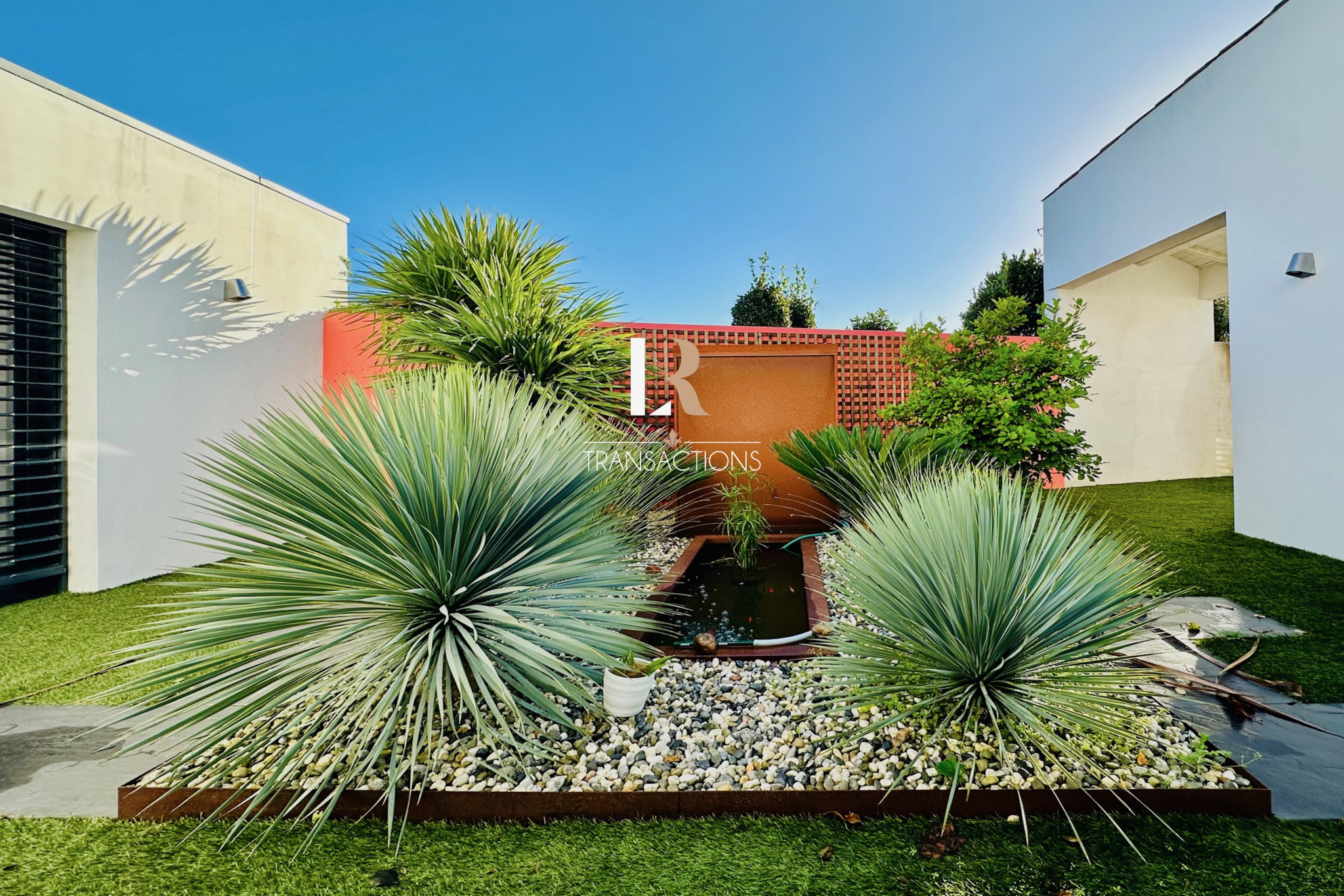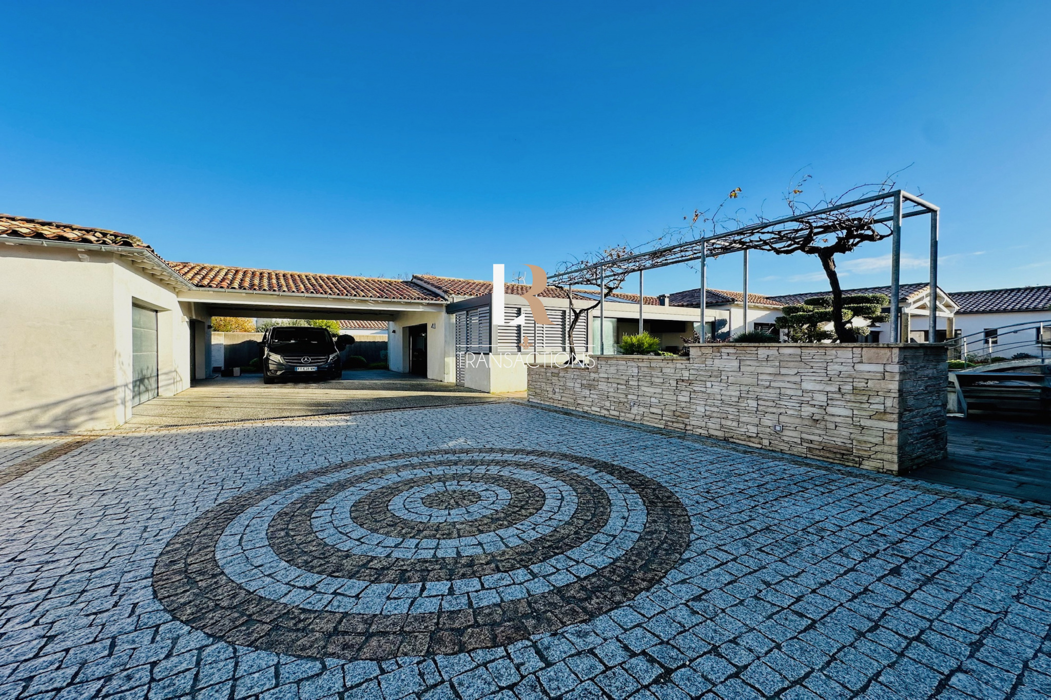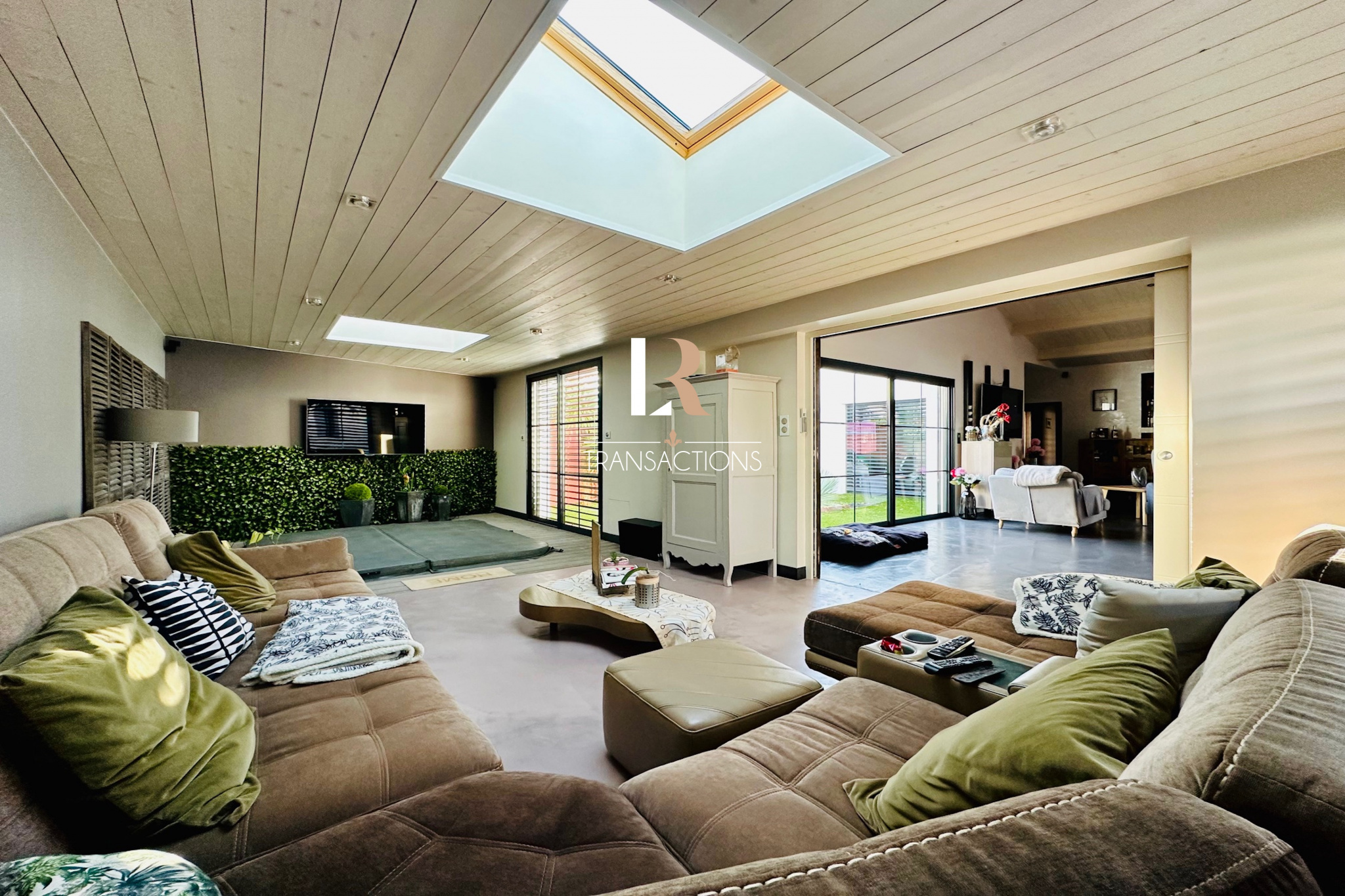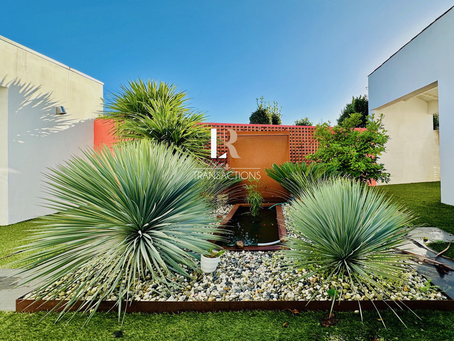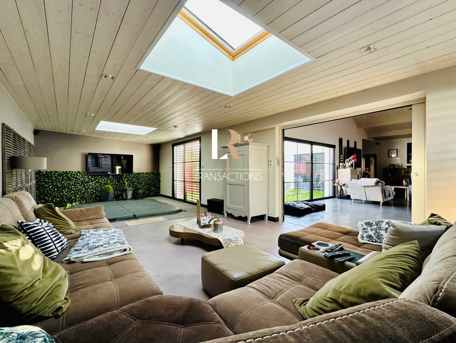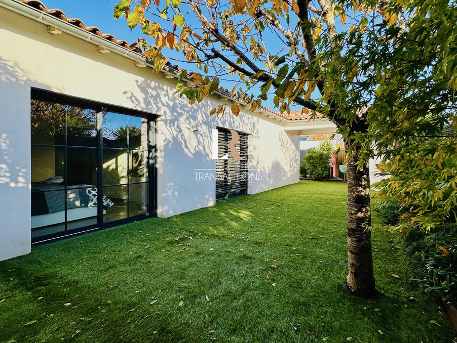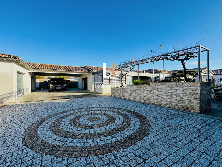 LR Transactions vous propose : En plein bourg de Lagord, à deux pas des commerces, de l'école et des transports, spacieuse maison entièrement de plain pied avec triple garage, multiples stationnements sur une parcelle de 1100m2 exposée plein Sud. Au calme, dans une impasse, vous accédez par un portail permettant de stationner de multiples véhicules grâce à sa cour d'accueil, son porche et ses trois garages (chauffés avec portes automatiques). Une belle entrée avec placard s'ouvre sur une spacieuse pièce de vie de plus de 90m2 par une élégante baie atelier sur mesure. Cette pièce de vie profite d'un plafond cathédrale et d'une triple exposition, cette dernière s'ouvre sur les extérieurs par une baie à galange. Vous trouverez également une spacieuse arrière cuisine buanderie attenante à la cuisine entièrement équipée avec de l'életroménager (plaques à induction, plancha, friteuse, ice maker, hottes roblin...). Dans la continuité de la pièce de vie, un salon TV avec jacuzzi et sa jolie vue sur un patio paysagé et sa cascade, sera parfait pour vos moments de détente. Côté nuit, vous profiterez une spacieuse suite parentale avec salle d'eau, dressing et sa vue sur la piscine. A l'autre extrémité de l'espace à vivre, vous trouverez quatres chambres dont une avec sa propre salle d'eau, et une salle d'eau indépendante. Chaque chambre s'ouvre sur les extérieurs, certaines sur patio, d'autres sur le jardin intimiste. Pour les amateurs de vin, une magnifique cave voutée de plus de 40m2 avec son bar, accueillera votre collection de bouteilles. Côté extérieur, tout les espaces sont paysagés, patio, jardin, une piscine en mosaîque de 12m de long dispose de deux hauteur de bassin différentes, parfaite pour le plaisir des petits comme des grands. Une cuisien d'été avec pergola amovible et éclairages intégrés, peut si vous le souhaitez se fermer intégralement par des portes coulissantes en verre. Cette dernière dispose de chauffage extérieurs. Cette maison intégralement de plain pied ne manque absolument de rien, bien unique sur la marché ! Le prix d'achat est de 1.599.000EUR HAI, dont 4% de frais d'honoraire d'agence TTC à la charge de l'acquéreur, soit 1.540.000EUR Net vendeur et 59.000EUR TTC d'honoraires d'agence.Diagnostics réalisés le 22/03/2023, informations énergétique sur le bien classé B et classé A pour les émissions de gaz à effet de serre. Les informations concernant les risques auxquels ce bien est exposé sont disponibles sur: https://www.geoportail.gouv.fr/