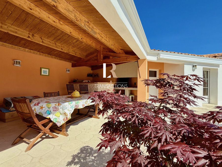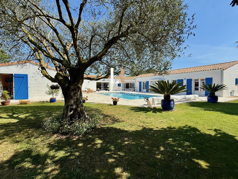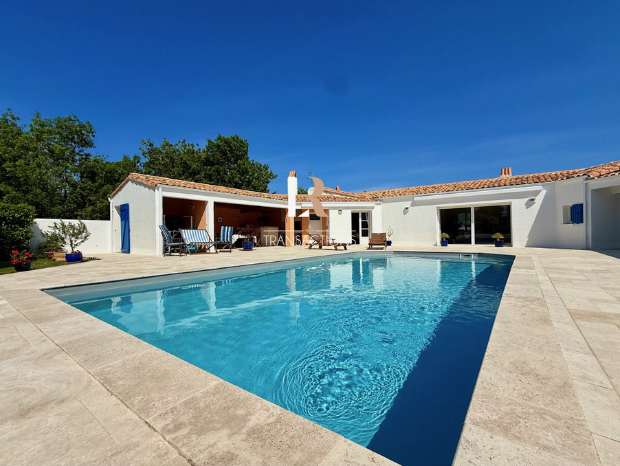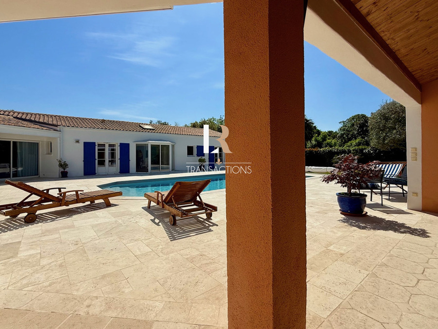 LR Transactions vous propose : Sur la commune de Lagord, à 15min en vélo du centre ville de La Rochelle, dans une impasse, spacieuse maison de plain pied de 2002 sur une belle parcelle arborée sans vis-à-visa Un portail automatique s'ouvre sur un bel espace de stationnement et donne accès à un grand garage et son atelier. L'entrée centrale offre une jolie perspective sur l'espace extérieur. Sur votre droite, vous découvrirez une belle pièce de vie traversante avec cheminée s'ouvrant par des baies à galandage sur la terrasse en pierre et sa piscine chauffée. Dans sa continuité une grande cuisine et son arrière cuisine feront le bonheur des amateurs de bons plats. Cette dernière donne accès, à une vraie cave, au garage. Sur la gauche de l'entrée, vous y trouverez un bureau, un petit salon (les deux pouvant devenir des chambres supplémentaires si besoin). Trois chambres dont une spacieuse suite parentale avec dressing et salle de bain donne accès à un premier espace bien-être avec jacuzzi. La seconde possède un petit salon et une salle d'eau privative, et bénéficie d'une entrée indépendante parfaite pour vos invités. La troisième avec placard est attenante à une salle d'eau indépendante. Trois wc indépendants sont repartis intelligemment dans cette spacieuse maison. Pour un maximum de bien-etre un hammam complète l'espace intérieur. À l'extérieur, une grande cuisine d'été entièrement ouvertes sur la terrasse et offre une vue sur le fond de jardin arboré. La maison est non mitoyenne, le jardin verdoyant parfaitement entretenu entoure cette maison à l'état irréprochable et la construction est de très bonne manufacture. Seul un petit coup de remise au goût du jour côté décoration est à prévoir, l'agencement est fluide et fonctionnel;
