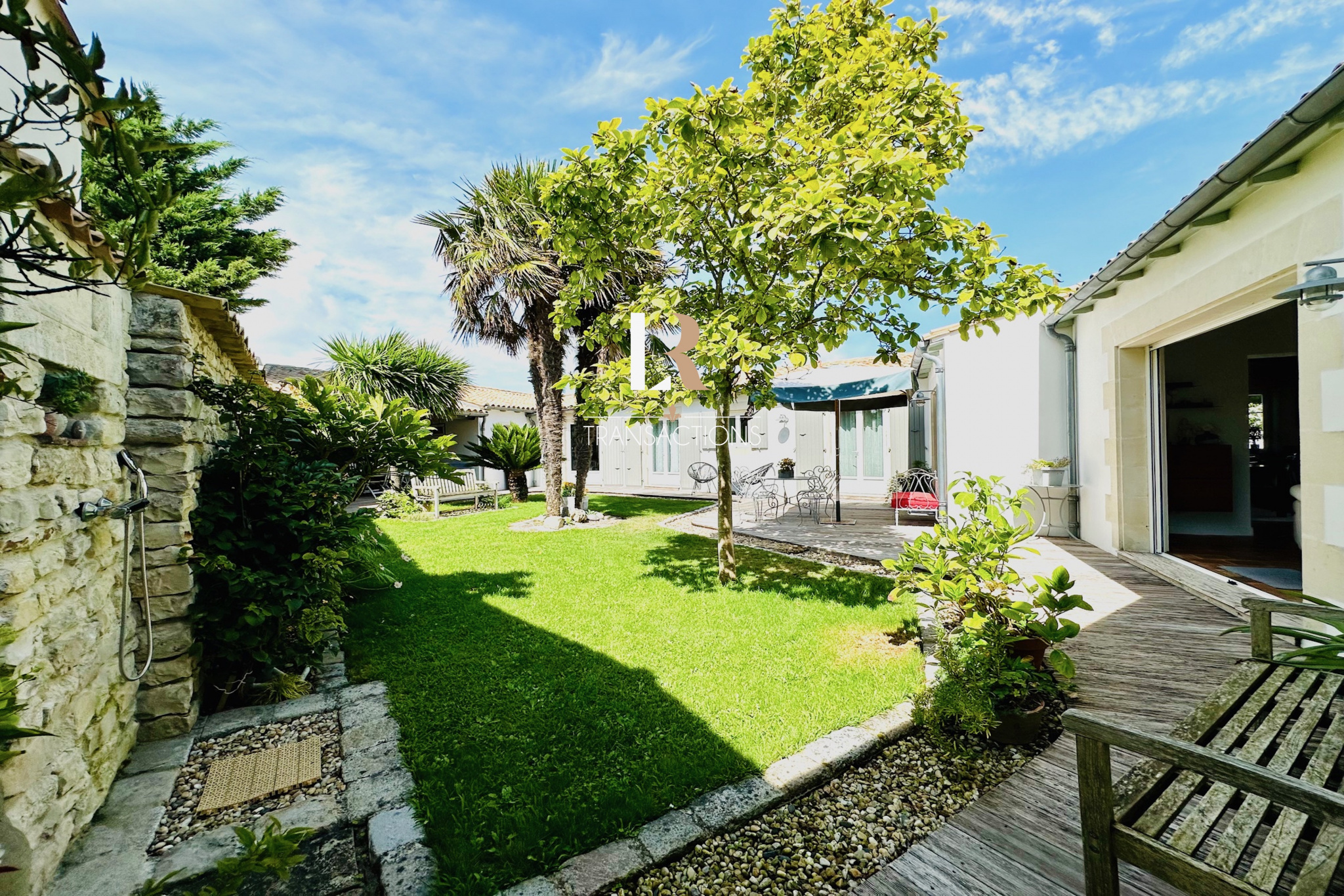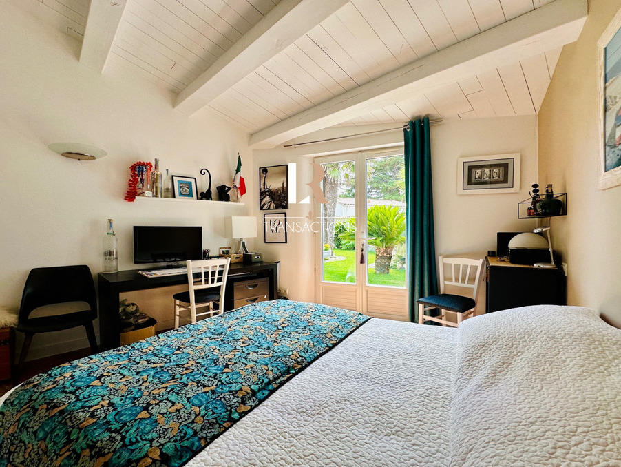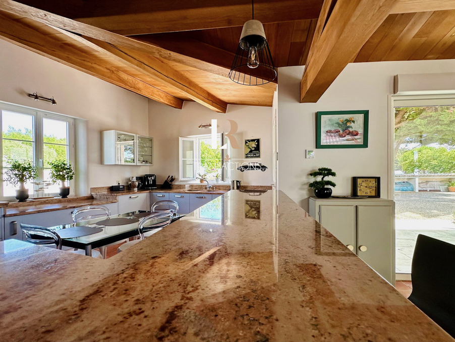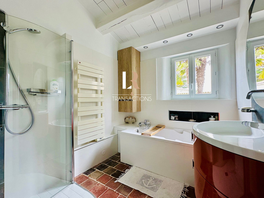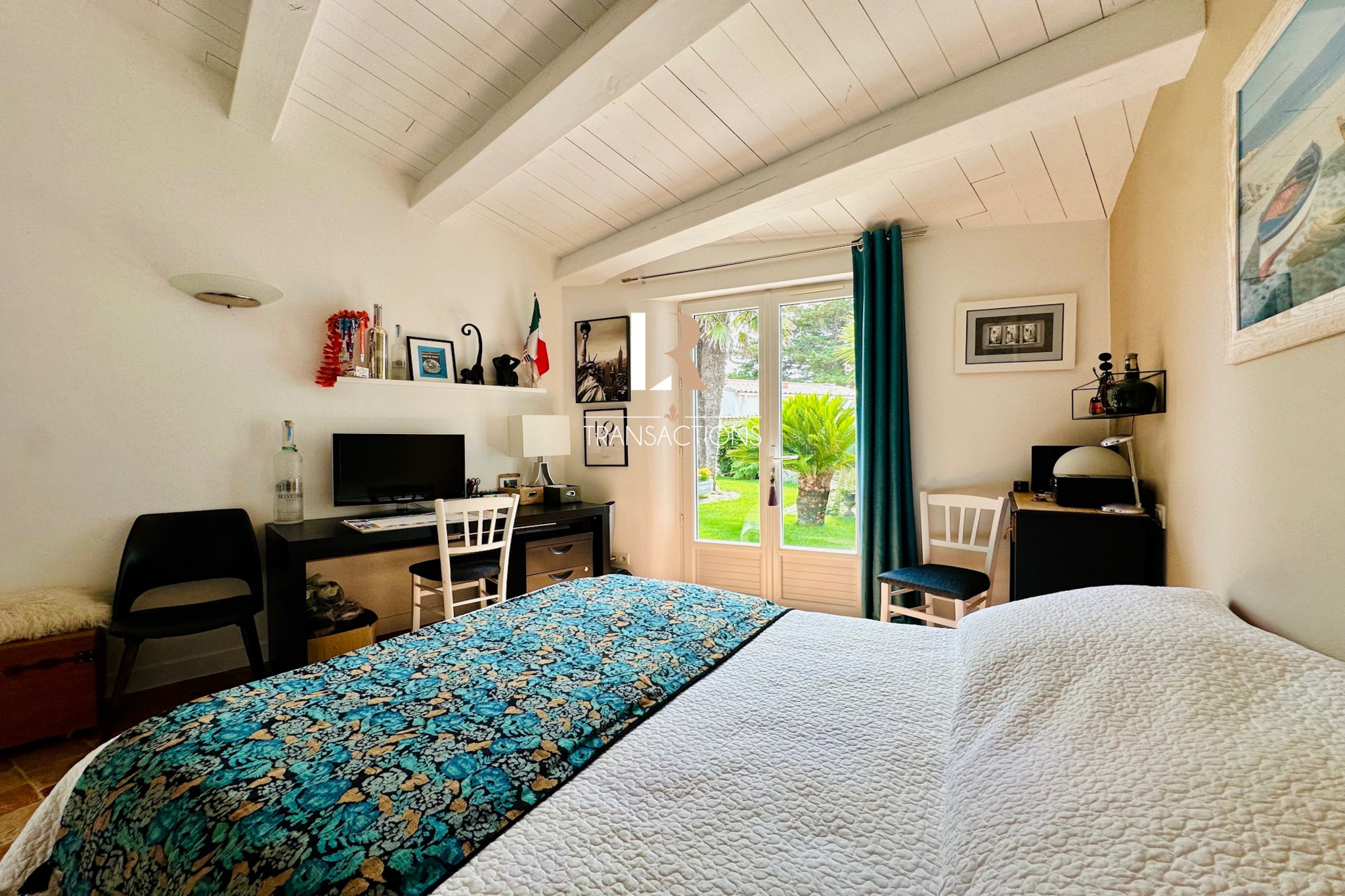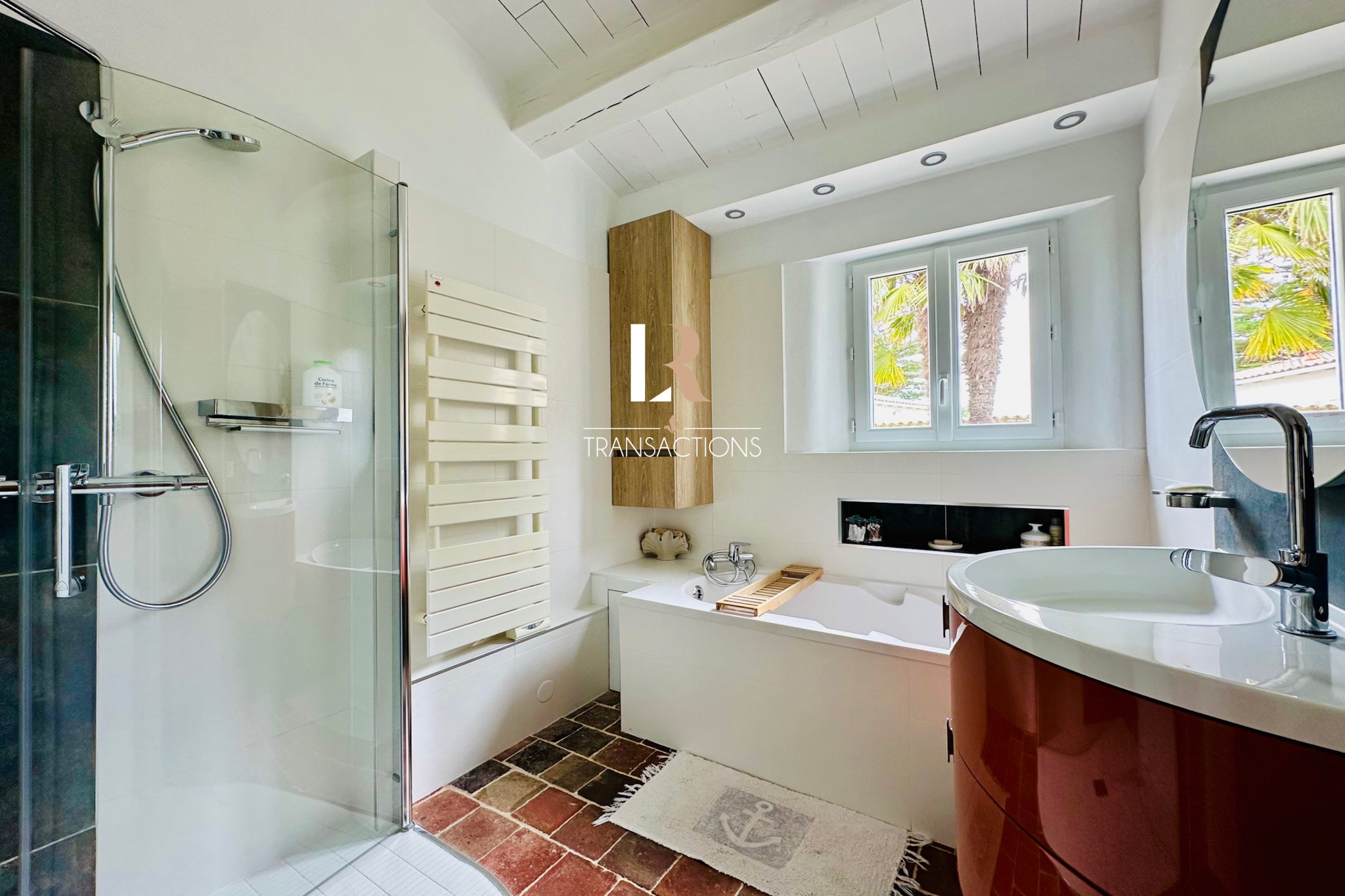 Seulement chez LR Transactions : Face à la mer, et de la jolie plage de Rivedoux Sud, maison de plain-pied aux prestations haut de gamme, construite avec des matériaux nobles, charpente en chêne massif, magnifiques pavés en terre cuites provenant d'un château parisien, des murs en briques enduits sur l'intégralité de la maison... amoureux des belles constructions, cette dernière est fait pour vous. Vous pénétrez dans les lieux par une spacieuse entrée avec placards et lumineuse grâce ses baies ateliers. Vous pourrez y contempler ses magnifiques portes en teck massif s'ouvrant sur l'espace de vie. Ce dernier est composé d'un espace repas traversant, s'ouvrant sur les deux extérieurs par des baies à galandage. Une belle cuisine entièrement équipée et aménagée profite également d'un accès à l'extérieur. Dans leur prolongement, un beau salon cocooning avec son poêle d'époque dispose des mêmes atouts. Côté nuit, une première chambre dite parentale avec placard, salle d'eau et wc se trouve à l'une des extrémités de l'espace à vivre. À l'autre extrémité, vous trouverez trois autres chambres avec placards dont une actuellement utilisé comme bureau, ainsi qu'une belle salle de bain complète. L'intégralité de la maison donne sur un joli jardin central et sans aucun vis-à-vis, et également piscinable si telle est votre envie. Vous profiterez d'un espace repas couvert parfait pour les soirées d'été. Ce dernier dispose d'un accès direct au jardin avant par un couloir couvert avec grenier. Une douche extérieur en pierre habille cet extérieur très agréable. Une buanderie et un double garage attenant complète cette maison d'exception. Pour terminer, le jardin avant à tout autant son importance et offre plusieurs stationnements. Un olivier entouré de sa belle terrasse en bois exotique vous permettra de contempler la mer en profitant du bruit des vagues. Vous n'aurez que quelques mètres pour accéder à la plage et avoir les pieds dans l'eau. Le prix d'achat est de 1.399.000EUR HAI, dont 4% de frais d'honoraire d'agence TTC à la charge de l'acquéreur, soit 1.350.000EUR Net vendeur et 49.000EUR TTC d'honoraires d'agence.Diagnostics réalisés le , informations énergétique sur le bien classé D et classé B pour les émissions de gaz à effet de serre. Les informations concernant les risques auxquels ce bien est exposé sont disponibles sur: https://www.geoportail.gouv.fr/